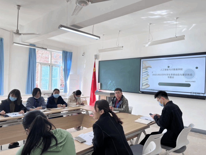 为深入学习贯彻习近平新时代中国特色社会主义思想,落实全国教育大会、高校思想政治工作会议精神,全面客观掌握新学期Beat365官网学生思想动态,增强新学期学生思想政治教育和管理的针对性、实效性。3月9日下午,人工智能与大数据学院在启行楼216会议室举行2022-2023学年学生思想动态与意识形态专题会。人工智能与大数据学院党总支书记兼学管副院长尹钧、学管办主任杨家腾、团总支书记王珊、招生就业办公室主任孟鑫、各教研室主任以及全体辅导员参加了此次会议,会议由学院党总支书记兼学管副院长尹钧主持。
