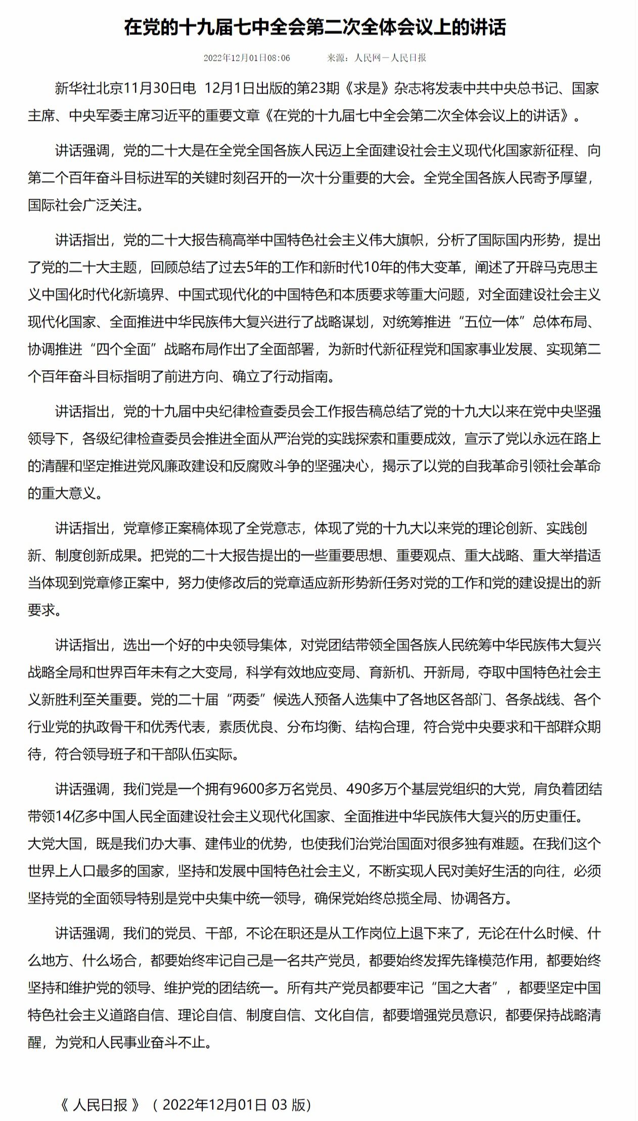 新华社北京11月30日电 12月1日出版的第23期《求是》杂志将发表中共中央总书记、国家主席、中央军委主席习近平的重要文章《在党的十九届七中全会第二次全体会议上的讲话》。