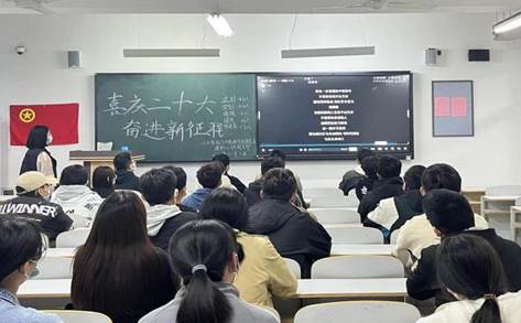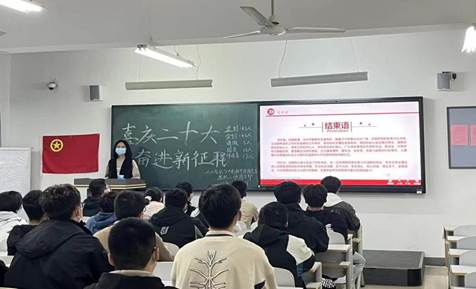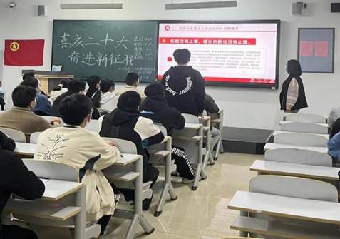 伴随着激情高昂的团歌,“喜庆二十大,奋进新征程”主题团课正式拉开帷幕,此次团课由各班团支书主持并主讲,各班团委辅助进行。首先,各班团支书带领学生了解有关“党的二十大报告”的具体内容,阐述了“党在新征程上仍高举中国特色社会主义伟大旗帜、坚定不移走社会主义道路,为全面建设社会主义现代化国家而团结奋斗”的伟大坚守。而后,通过放映学习党的二十大会议相关视频内容,使青年学生更加深刻体会到了百年大党信仰如山、初心如磐的执着与坚定。最后,各班团支书向本班学生讲解此次党的二十大会议主题,倡导青年学生高举中国特色社会主义伟大旗帜,全面贯彻习近平新时代中国特色社会主义思想,自信自强、守正创新,踔厉奋发、勇毅前行。