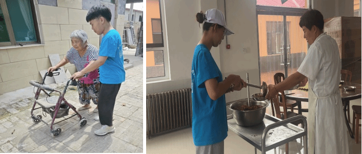 走进敬老院后,队员在工作人员的带领下,对老人所居住的地方进行了打扫,帮助老人打饭,为腿脚不便的老人“保驾护航”,通过在敬老院的志愿服务,队员们了解到了孤寡老人在生活中的诉求,同时也为农民养老保障建议的提出提供了思路。