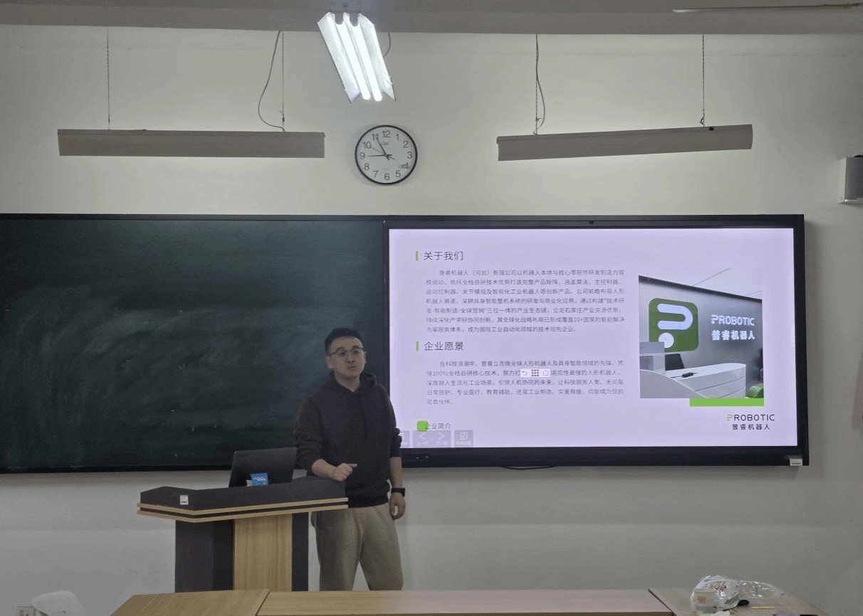 座谈现场,企业代表李瀚博、王浩友、张会峰依次介绍普睿机器人在工业智能装备研发、机器人场景化应用等领域的技术布局与产业化成果,重点分享其在人工智能、机器人、智能制造等赛道的落地案例;学院则结合自身在人工智能算法、机器人系统开发等方向的科研积累,以及现有专业人才培养的实践需求,阐述了校企协同的合作契机。