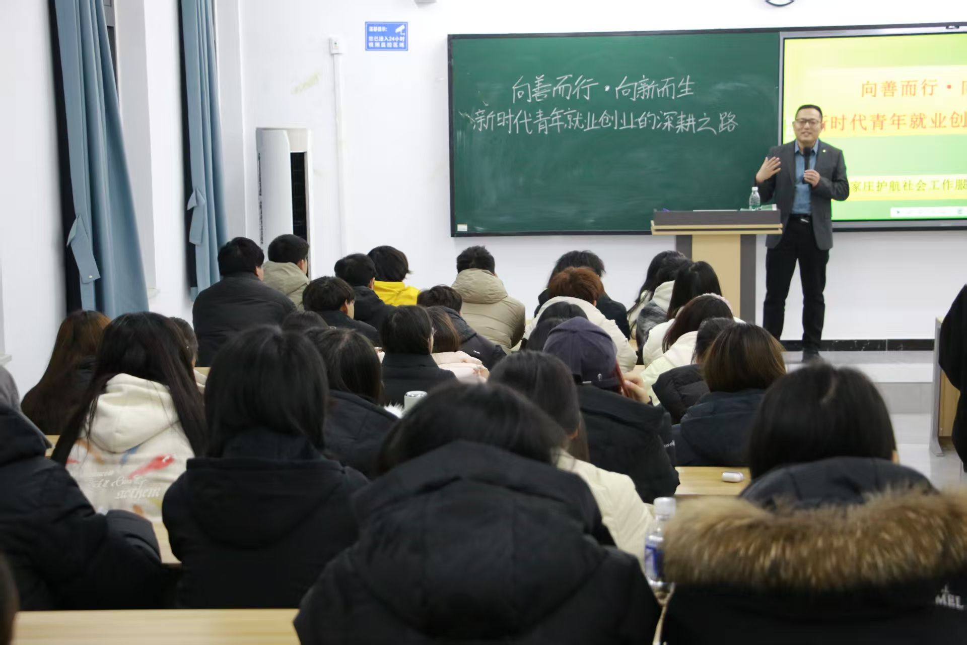 作为公益创业的成功实践者,张海忠老师还结合企业成长历程,为在场学生提供了切实可行的职业发展建议。他分享了从项目设计到落地推广的全过程,展示了“山区食堂”“共享洗衣房”等项目背后的社会价值与职业机遇。他提到:“真正的英雄主义不是没有眼泪,而是含着眼泪依然奔跑”,鼓励青年在面对职场挑战时保持韧性与热爱。他现场发布了中心针对项目管理、一线服务等岗位的招聘计划,欢迎同学们勇于尝试,在服务社会的实践中实现人生价值。