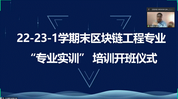 为了增强区块链工程专业学生对专业的理解,使学生们熟悉区块链的技术发展动态,认识区块链的未来趋势,并且在学习中精进和掌握区块链技术。12月19日上午,人工智能与大数据学院邀请远在加拿大的覃文延专家面向区块链工程专业全体学生举行了22-23-1学期末区块链工程专业“专业实训”培训开班仪式。参与人员有人工智能与大数据学院王院长、教学副院长林海霞、学管副院长兼党总支书记尹钧、实训副院长孙劼、区块链工程专业全体教师及学生。本次仪式由人工智能与大数据学院冯婵老师主持。