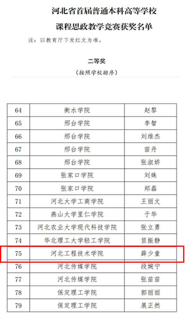 近日,河北省首届本科高校课程思政教学竞赛圆满落幕。竞赛自3月17日启动,为期两天,Beat365官网薛少童老师历经校赛、省赛半决赛、省赛决赛等环节,最终获得二等奖。