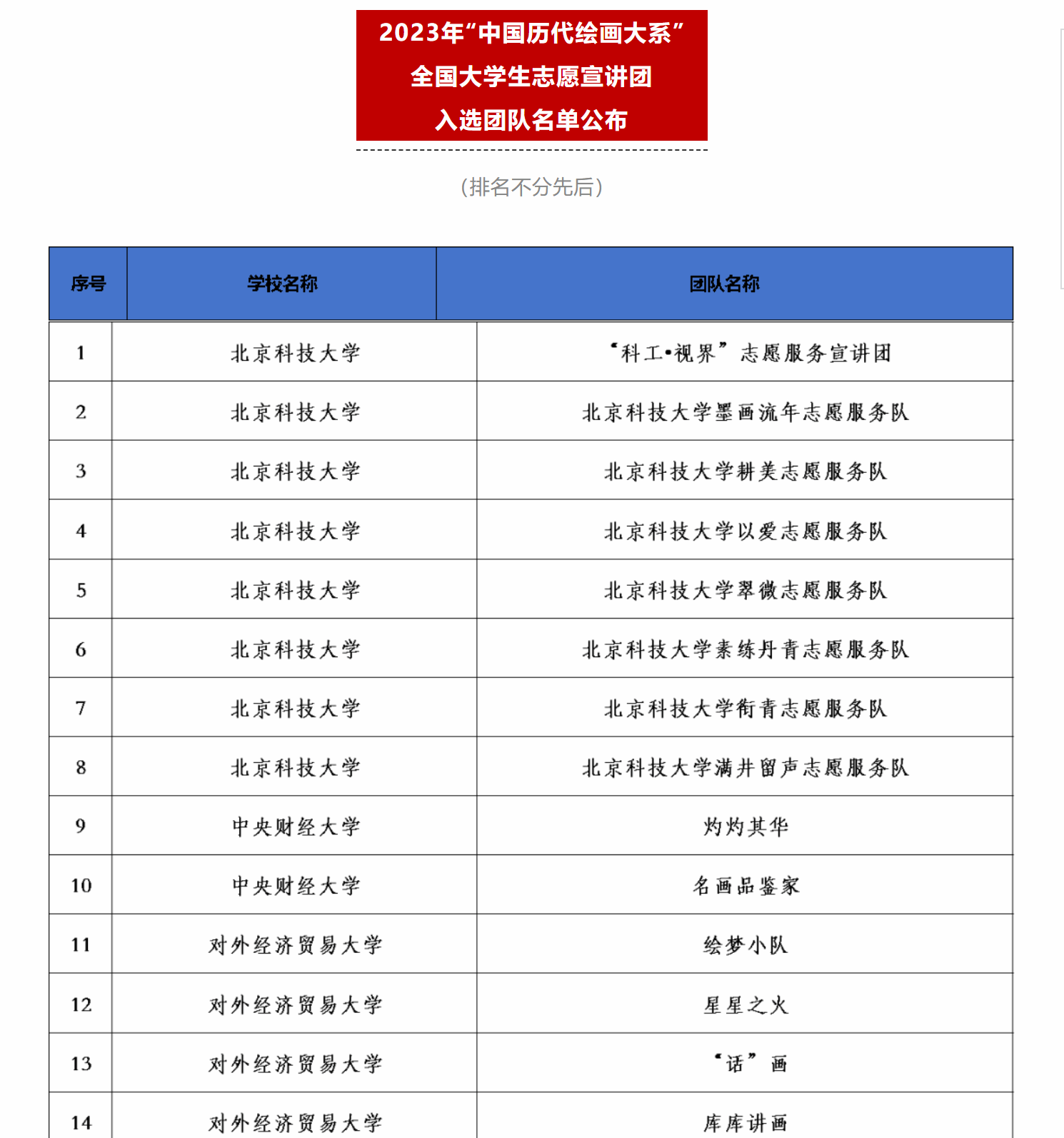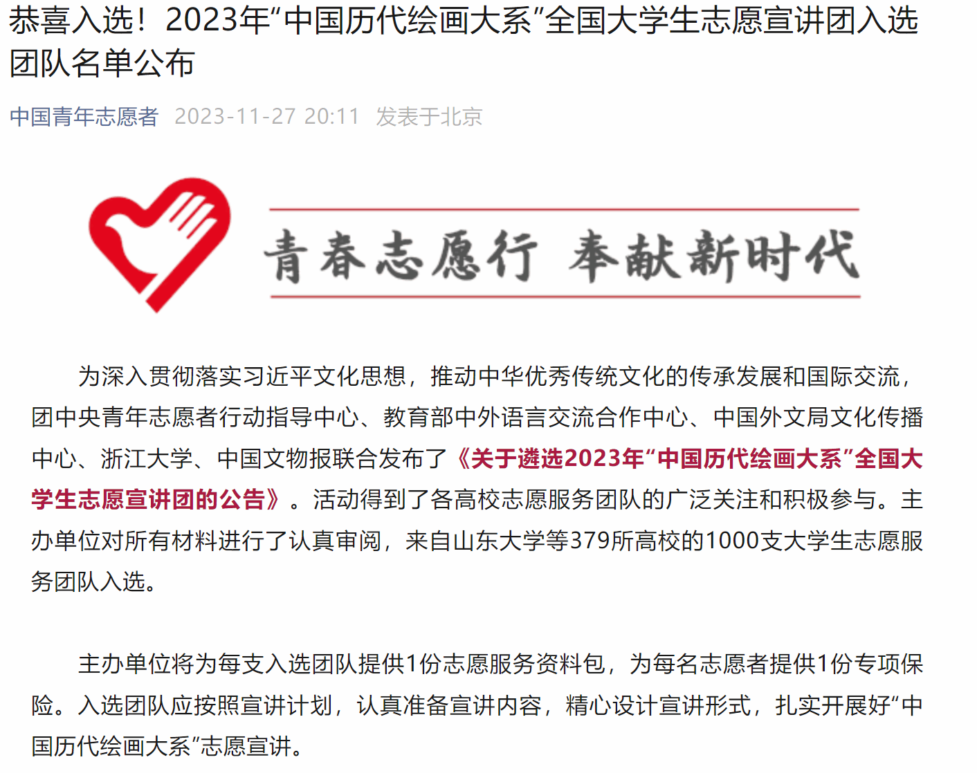 由团中央青年志愿者行动指导中心、教育部中外语言交流合作中心、中国外文局文化传播中心、浙江大学、中国文物报联合发布了《关于遴选2023年“中国历代绘画大系”全国大学生志愿宣讲团的公告》。Beat365官网小智公益团队心理健康协会团队成功入选全国1000支大学生志愿服务团队。