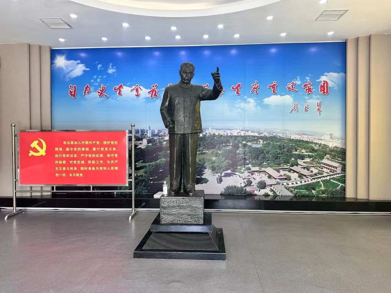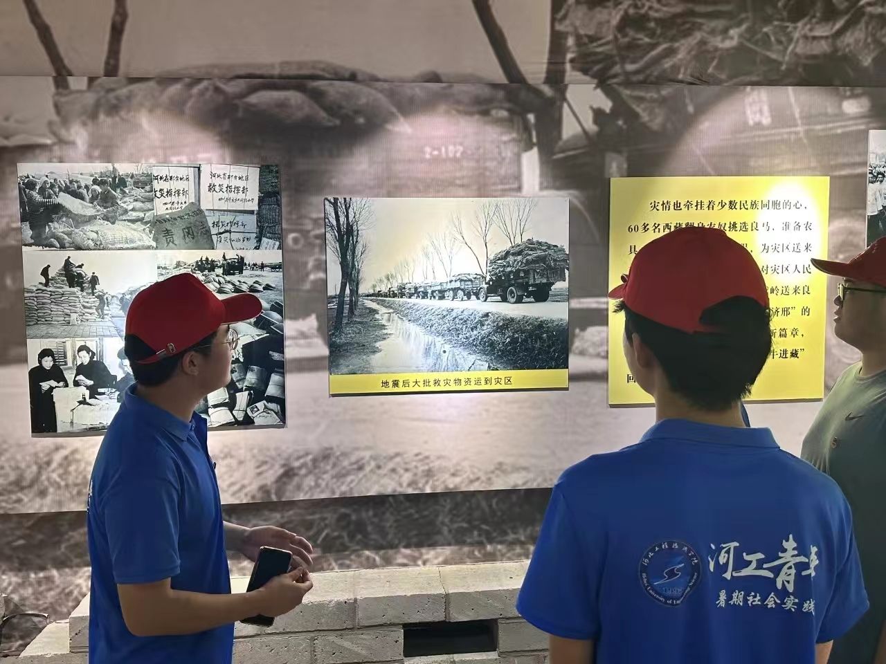 随后,红韵智旅团走进抗震纪念馆,首先映入眼帘的是周恩来总理在慰问灾区群众大会上讲话形象的汉白玉全身塑像。通过参观抗震纪念馆,实践团队了解了邢台地震的历史背景、地震的破坏程度、救援行动以及灾后重建等相关资料,看到了由著名作曲家李劫夫谱曲的歌曲《天大地大不如党的恩情大》的歌词:“天大地大不如党的恩情大,爹亲娘亲不如毛主席亲,千好万好不如社会主义好,河深海深不如阶级友爱深......”,深深的表达了灾区人民对党和政府的无限感激,对毛主席的深厚感情以及对社会主义制度的坚定信念。歌词中的这些话语不仅仅是简单的对比,更是灾区人民内心真实情感的流露。
