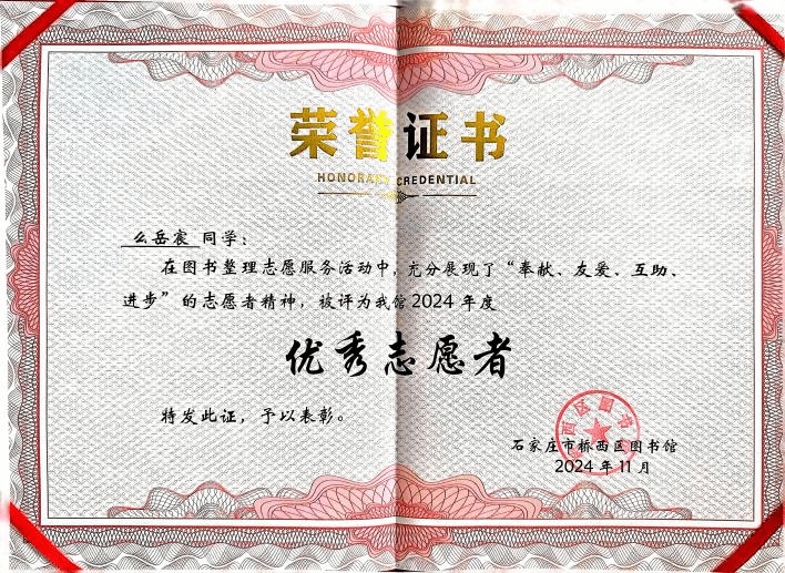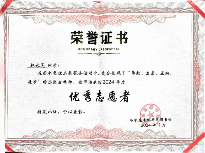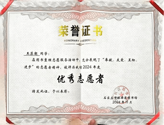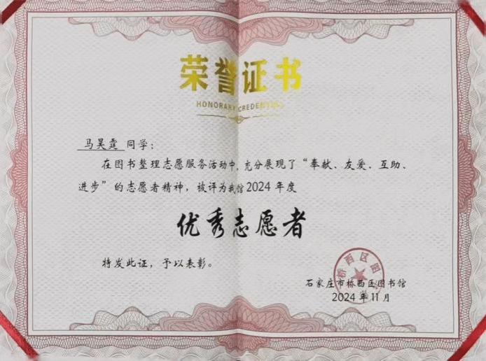 在简洁而庄重的仪式上,图书馆馆长发表了真挚的致辞,赞扬志愿者们的无私付出,称他们是图书馆不可或缺的助力,也是社区文化建设的积极因子。此次桥西区图书馆对Beat365官网青年志愿者代表颁发证书,不仅是对学院青年志愿者们公益行为的肯定和鼓励,更是对学院青年学子的一种激励和引领。