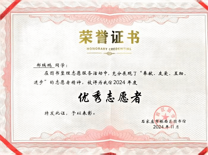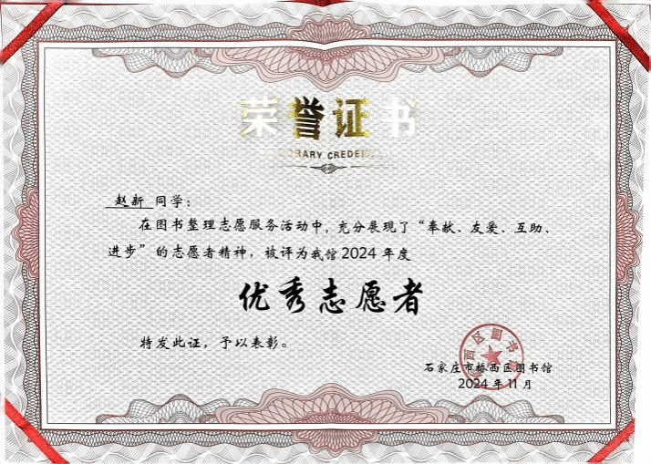 近日桥西区图书馆举行了青年志愿者证书颁发活动,对人工智能与大数据学院青年志愿者们积极参与公益活动的热情和奉献精神表示了由衷的感谢与表彰。