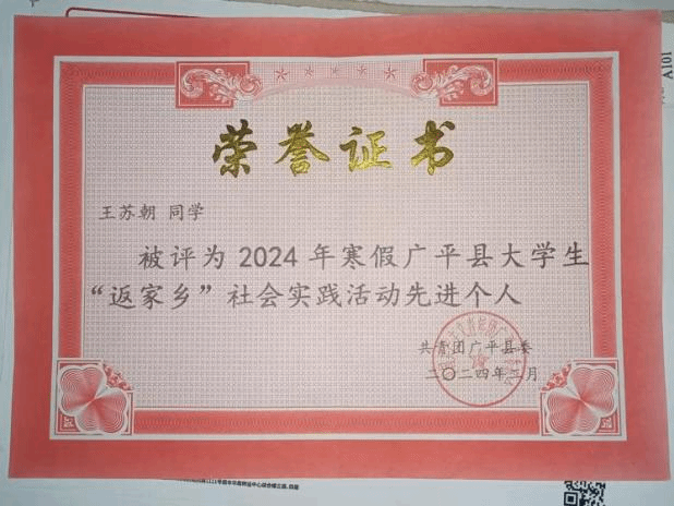 习近平总书记强调,“未来属于青年,希望寄予青年,青年之于党和国家而言,最值得爱护、最值得期待。”在2024年-2025年寒假,王苏朝第三次投身于大学生返家乡社会实践中。“返家乡”社会实践是了解国情、认识县情、增长本领的最好课堂,是磨炼意志、汲取力量的火热熔炉,是理论联系实际、从校门走向社会的生动实践。