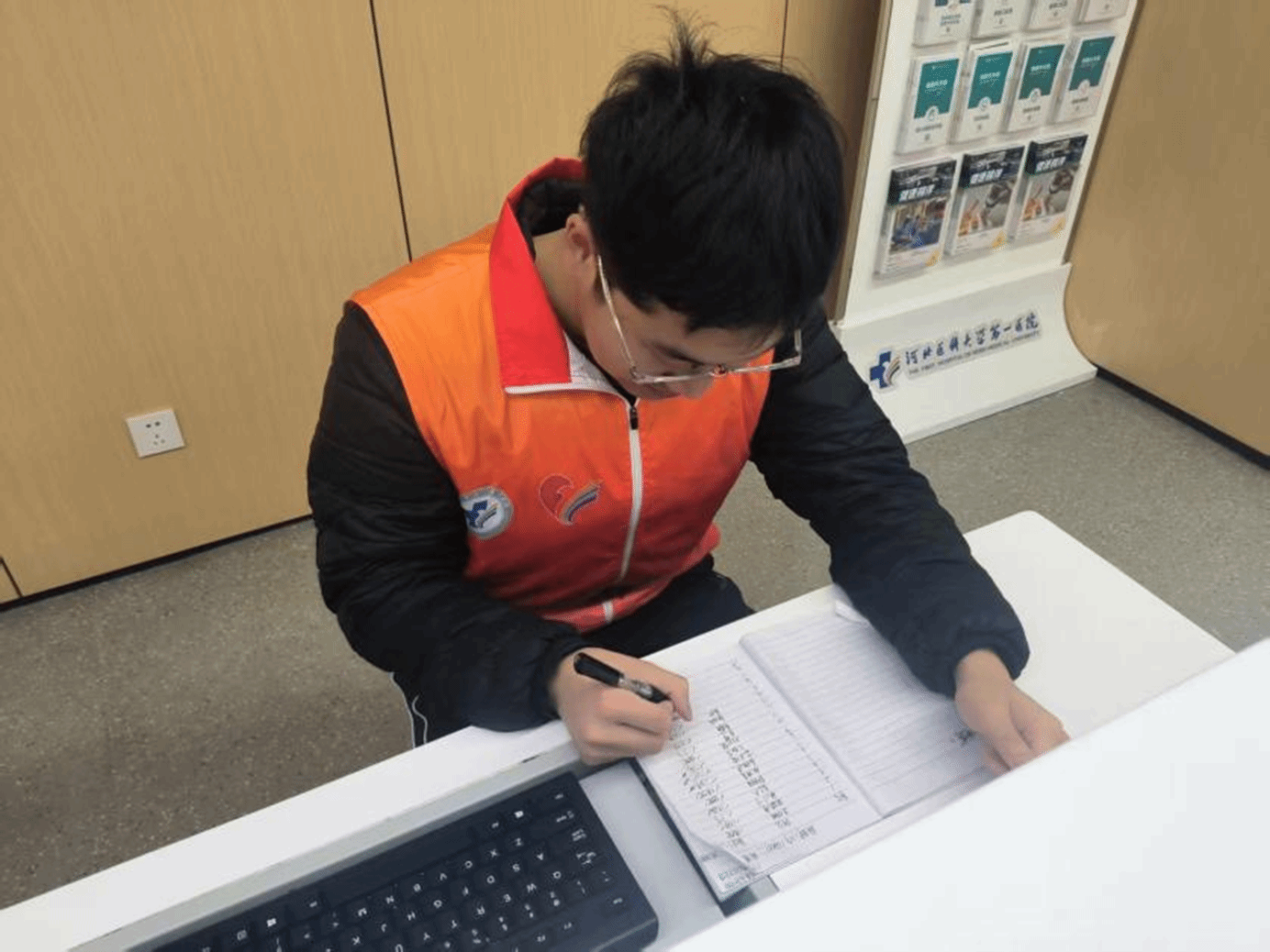 王一博日常坚守在门诊楼各楼层智慧自助机旁,重点协助老年群体患者使用智能设备。从建档办卡、预约挂号到缴费取号、检查签到,他和其他志愿者通过"一对一"指导,帮助患者平均缩短等候时间,他回忆道:“记忆深刻的是在麻醉门诊值班的时候来医院的患者都比较着急,而麻醉门诊那里缺少一个排号的机器需要我去记名叫号,随着时间的推动,现场秩序的维护压力会逐渐变大,越是这个时候越要耐心,主动和患者聊天缓解压力等等,只有排好顺序,不乱套,才能更快的看病就医”。