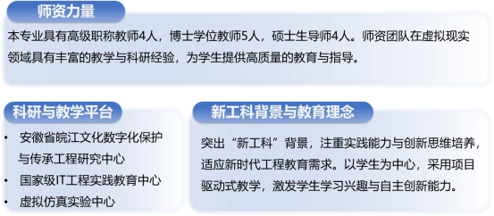 虚拟现实技术专业获批以来,融合人工智能、虚拟现实、游戏开发、音视频专业技术,构建前沿交叉学科体系,为专业提供强大的学术支撑与技术保障。本专业融合技术与创意,培养兼具工程能力与艺术素养的复合型人才,满足市场多元化需求。以“VR+文旅”“VR+游戏“VR+教育”“VR+健康”为特色,打造独特的专业优势与竞争力。