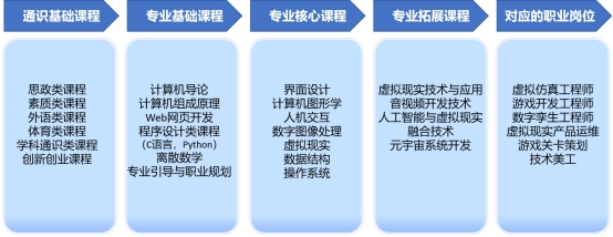 虚拟现实技术专业课程体系包含四大模块。前期的通识教育课程、专业基础课程及计算机大类平台课程为专业学习打下坚实基础。专业核心课程如界面设计、计算机图形学、人机交互、数字图像处理、虚拟现实、数据结构、操作系统等,引领学生深入探索虚拟现实技术与原理。集中实践课程包括虚拟仿真综合系统开发课程设计、元宇宙综合系统开发课程设计、毕业实习等,有效强化学生的实际操作和工程应用能力。