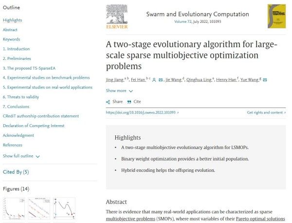 近日,学院蒋京博士在国际顶级期刊《Swarm and Evolutionary Computation》上发表了题为《A two-stage evolutionary algorithm for large-scale sparse multiobjective optimization problems》的研究论文,提出了一类求解大规模稀疏多目标优化问题的多目标进化算法。蒋京博士为论文第一作者,开云kaiyun官方网站为第一署名单位。