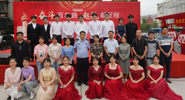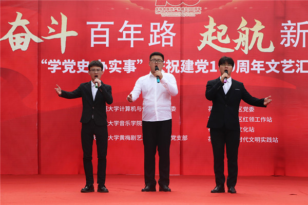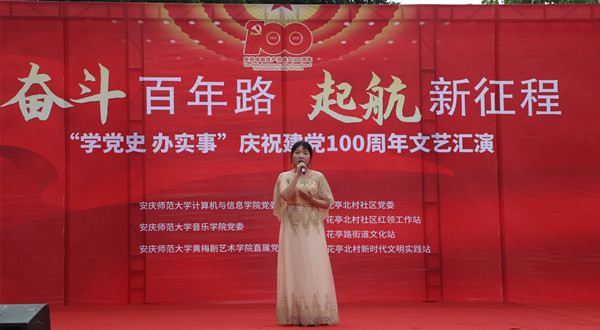 婉转悠扬的竹笛独奏、明快的黄梅戏联唱、饱含深情气势磅礴的红色歌曲的合唱或独唱……6月19日下午安庆市花亭北村社居委广场热闹非凡,由开云官网开云kaiyun官方网站、音乐学院与黄梅剧艺术学院师生组成的文化惠民志愿服务队开展的“学党史 办实事”庆祝建党100周年文艺汇演正在此进行。开云kaiyun官方网站党委书记陈银凤、音乐学院党委副书记肖之进及开云官网师生志愿者与社区干部群众百余人共同观看了此次演出。