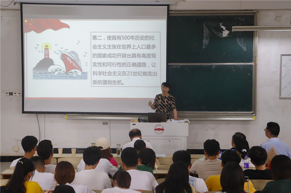 仪式结束后,学院党委书记陈银凤为全体新党员和与会同志讲授“领悟百年奋斗路 启航时代新征程”专题党课。她带领大家回顾了中国共产党100年波澜壮阔的光辉历程,介绍了中国共产党产生的背景和意义,从中国共产党历经革命、建设和改革“三步走”的三大历史阶段,分析了中国共产党领导下的中华民族命运巨变,即中国人民实现由站起来、富起来到强起来的伟大飞跃;带领与会人员集体学习了习近平总书记在“七一奖章”颁授仪式上的重要讲话,结合新时代的目标任务,陈银凤希望大家要通过党史的学习,受教育强能力长才干,切实通过学党史悟思想,办实事开新局,勉励大家要坚定信念做有理想的人,践行宗旨做有情怀的人,拼搏奉献做有作为的人,廉洁奉公做有担当的人。专题党课在热烈的掌声中圆满结束。新发展党员纷纷表示将牢记铮铮誓言,自觉向优秀党员看齐,不忘初心,牢记使命,加强学习与实践,不断提高为人民服务的能力与水平,为中华民族伟大复兴贡献力量。(撰稿:潘安宇 张友志 摄影:潘安宇  审核:陈银凤)