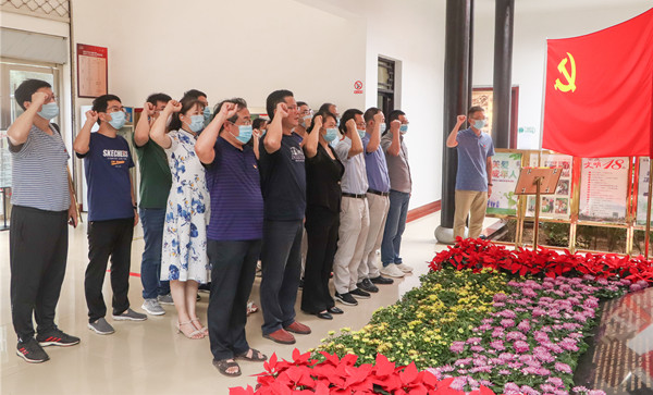 在黄镇生平事迹陈列馆黄镇将军半身铜像前,全体党员佩戴党员徽章,面对鲜红的党旗,高举右拳,庄严宣誓,重温入党誓词,铿锵誓言让现场党员们进一步铭记了入党初心,进一步强化了立德树人的时代使命担当。