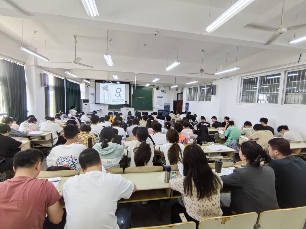 课上,朱娟娟老师首先简单回顾专用键盘/显示器接口芯片HD7279A简介、引脚说明与电气特性。随后,引出单片机与HD7279A的接口电路设计以及应用领域。在讲解中,朱老师通过链接国产芯片企业官网下载技术文档供学生参考学习,播放官网HD7279A工作视频,同时展示HD7279A的国产化提升了国内芯片产业的自主可控能力。将复杂抽象的芯片知识直观化,极大地激发了学生的学习兴趣。最后,重点介绍HD7279A控制命令及其驱动LED数码管显示的原理。在整个教学活动中,朱娟娟老师仪容仪表规范,授课生动热情、条理清晰、循序渐进,并结合超星学习通等智慧教学工具开展了随机点名回答、抢答和作业布置等形式多样的课堂活动。师生互动积极,课堂气氛热烈。