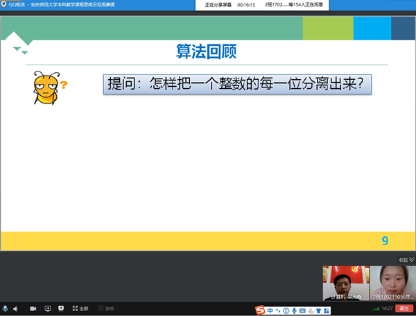 为了进一步落实教育部印发的《高等学校课程思政建设指导纲要》文件精神,全面推进高校课程思政建设。6月8日上午,开云官网副教授吴海峰老师应教务处教学能力发展中心的邀请,通过QQ直播平台讲授《程序设计基础》课程思政线上教学示范课,来自各学院的两百余名老师在线进行了观摩。