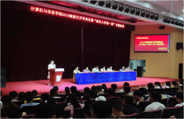 刘奎介绍了学校和学院的教学管理规定、学生日常管理规定。他强调了学风建设的重要性 ,告诫同学们一定要杜绝 “玩命的中学,轻松的大学”的错误思想,从入学第一天起,就要端正态度,严格要求自己。郑馨博士作为教师代表发言,她分析了计算机专业的社会发展前景,分享了对大学生活的感悟和经验,希望大家勤学苦练,抵制诱惑,不断坚持,才能在大学有所收获。2019级研究生代表孙满贞,本科生代表王晓雨相继上台发言。她们承诺,一定会牢记嘱托,在即将开始的大学生活里珍惜时间,树立目标,刻苦学习,不辜负学院和家庭的期望。