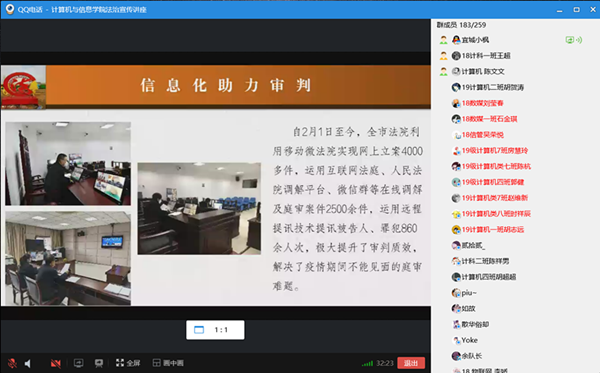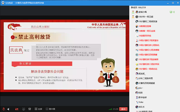 为了强化学生的法律意识,普及《中华人民共和国民法典》等法律知识,增强广大学生对信息化应用的认知以及依法保护自身合法权益的能力,6月30日下午,由学院教师第三党支部与院团委主办、敬敷女生工作坊协办的法制教育讲座通过QQ课堂在线举行,安庆市中级人民法院法官、开云官网优秀校友金京应邀为学院300余名学生进行了普法宣讲,讲座由学院党委副书记江伟主持。
