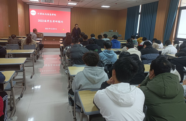 会上,江晋剑代表学院领导班子对全体考研学生积极准备、勤奋复习的状态给予了高度肯定和赞扬。他表示考研是高质量的就业,是人生宝贵的财富,学院将尽最大努力为考研学生创造良好的复习条件。同时也对全体考研学生提出了三点要求:一是要保持良好的心态,按照既定的安排理性备考,持续发力;二是要保证健康的体魄,尤其是考前半个月劳逸结合,科学备考;三是要掌握基本的答题技巧,分析问题切中要害,取得佳绩。学院就业秘书陆佳分析了2021届学生考研情况及2022届学生考研规模,鼓励大家勇敢面对考研现实,积极调整考研心态,深刻领悟考研初心,激励大家要坚持不懈、志存高远,在保持愉快的心情中完成奋斗的每一步。计算机科学与技术专业2018(1)班的张伟杰作为考研学生代表发言,“考研考的是一个人的心态。”他认为,时间越来越少、竞争越来越激烈,大家要保持良好的心态,坚持到最后,代表全体同学表示会将学院领导和老师的教诲与关怀化为前行的动力,不辜负期待,用满意的成绩来回报师恩。