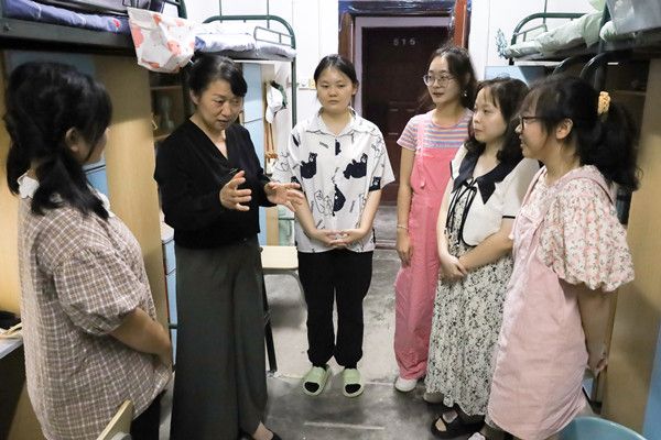 走进517寝室,看到几位学生正围成一圈,畅谈开学的所见所闻。陈银凤对融洽且活跃的寝室氛围提出表扬。她向学生讲述了学校某寝室“八朵金花”考研上岸的事迹,并对她们提出期待:“希望四年后,我能够看到你们寝室考研进入理想大学,谱写‘六朵金花’的故事。”