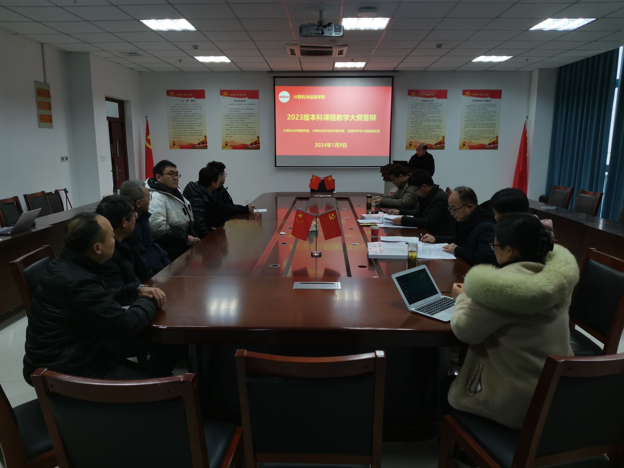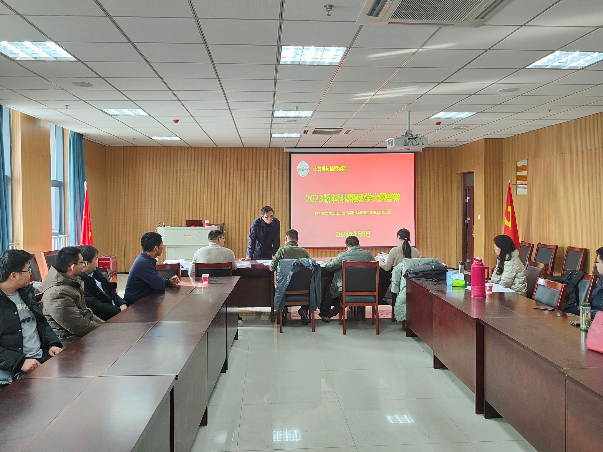 计算机公共课教研室、计算机科学与技术教研室和数据科学与大数据教研室安排在L318会议室参加第一组答辩,数字媒体技术教研室、智能科学与技术教研室和物联网工程教研室安排在L302参加第二组答辩。各教学大纲执笔人现场汇报了本课程2023版教学大纲的编制情况,主要包括课程目标设定、课程目标与毕业要求对应关系、教学内容支撑课程目标、教学方式、考核方式、课程目标达成度评价、课程思政等内容。答辩专家针对答辩过程中出现的问题提出了修改意见与建议,如:课程目标需要聚焦产出导向OBE理念,表述需要紧扣毕业要求子目标;简化课程目标达成度计算方法;规范化课程评分标准等。