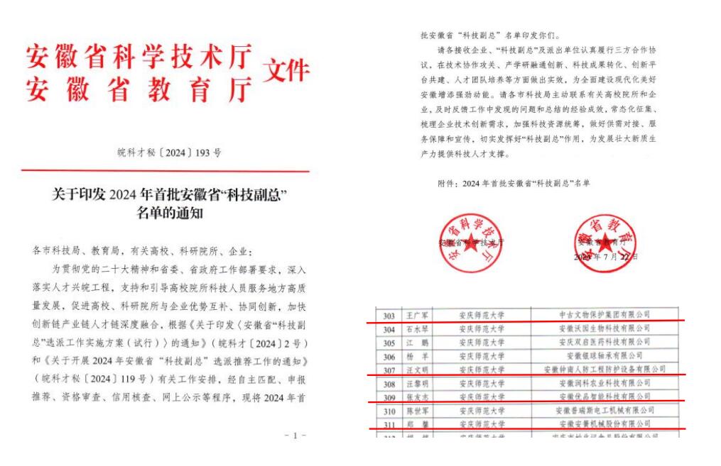 近日,安徽省科技厅、安徽省教育厅联合发布了《关于印发2024年首批安徽省“科技副总”名单的通知》,开云官网11名科技人员成功入选,其中学院郑馨、王广军、汪文明、张友志4名副教授入选本批次“科技副总”。
