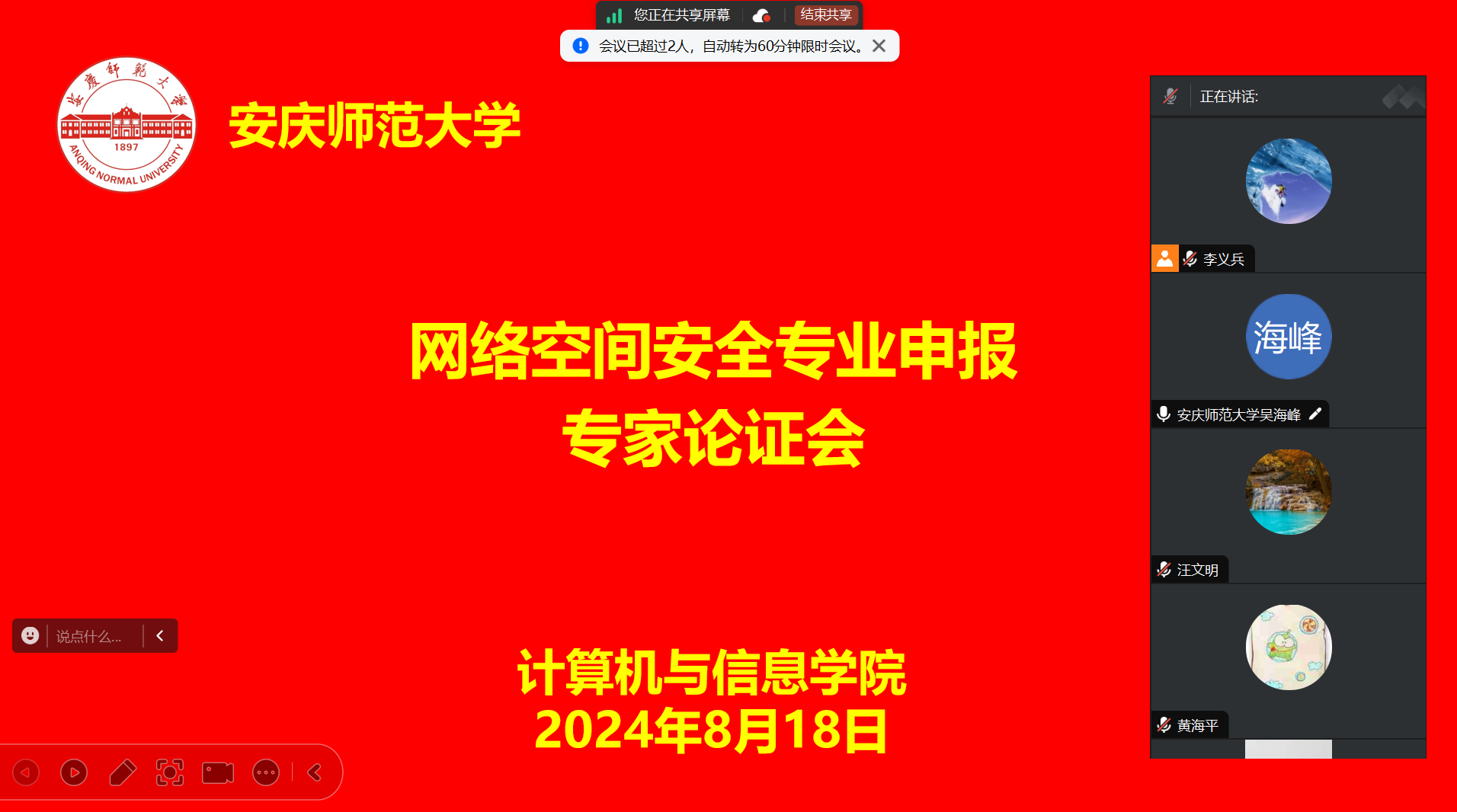 为进一步加强专业建设,优化专业结构,提高新专业申报建设质量,8月18日下午,开云kaiyun官方网站在线召开了网络空间安全专业申报专家论证会。会议邀请南京邮电大学网络空间安全学院副院长黄海平教授、暨南大学网络空间安全学院教授刘志全教授、安徽师范大学教授算机与信息学院副院长接标教授、安徽大学网络空间安全系主任朱二周博士、中共安庆市委网信办网络舆情管理和执法治理科科长章慎担任论证专家,教务处处长潘锦云、教研科科长朱亭曲、副院长王远志、物联网工程教研室主任汪文明、新专业教师代表及教学办公室成员参加论证会,会议由副院长吴海峰主持。
